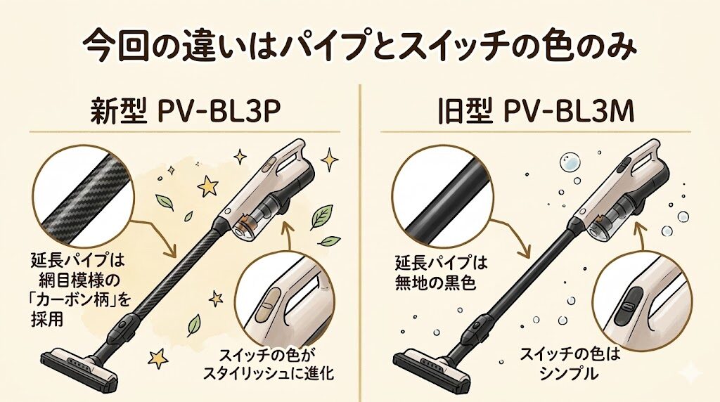 新型のPV-BL3Pは、持ち手からヘッドへつながる延長パイプに網目模様の「カーボン柄」を採用。