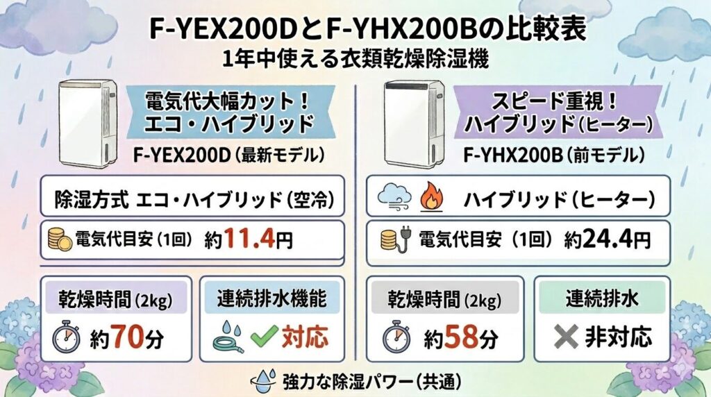 【違いを徹底比較】パナソニックF-YEX200DとF-YHX200B|電気代や除湿方式が進化した衣類乾燥除湿機