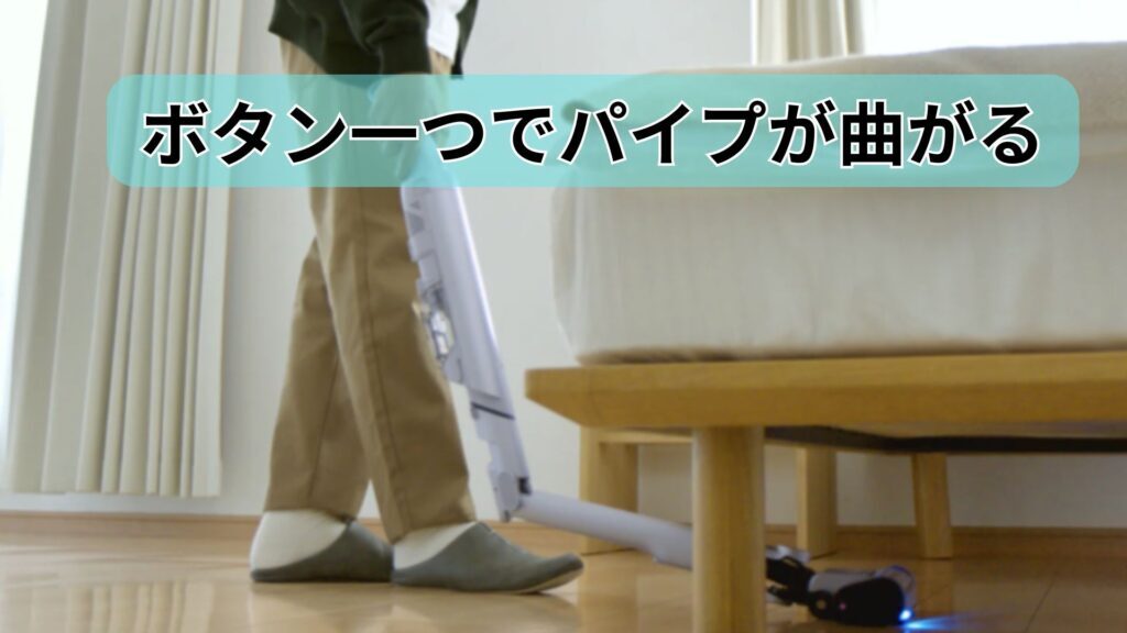 ボタンひとつでパイプが曲がるため、ソファやベッドの下も立ったまま楽な姿勢で掃除が可能。